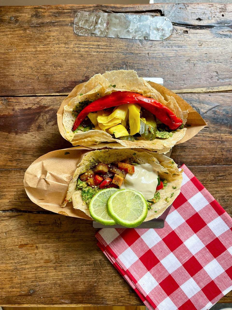 Mit Oz Ben David, dem israelischen Mitbetreiber vom «Kanaan» und Co-Autor des Kochbuchs «Kanaan - Kochen ohne Grenzen» hat sich der palästinensische Jalil Dabit eine Falafel mit einem überraschenden Dreh ausgedacht. Da werden die Falafel nicht frittiert, sondern auf Mini-Tortillas mal nicht als Bällchen, sondern glatt gebacken - und mit Tomaten-Paprika-Salat und einem Klecks Tahini serviert. Und so geht der Twist: