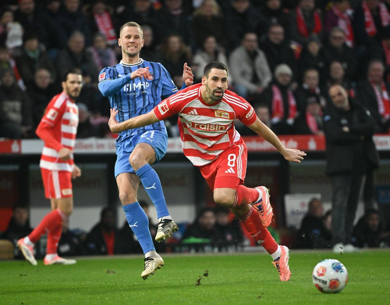 Union Berlin hat erneut einen Sieg in der Bundesliga gegen den 1. FC Heidenheim verpasst - und das beim 1:2 auf besonders dramatische Weise. Im fünften Vergleich führten die Köpenicker durch ein Tor von Rani Khedira (43.) zwar lange, wurden am Ende aber doppelt bestraft. Stefan Schimmer (90.) und Jan Schöppner (90.+5) drehten die kampfbetonte Partie zugunsten der Heidenheimer, die durch den Auswärtssieg den letzten Tabellenplatz verließen.