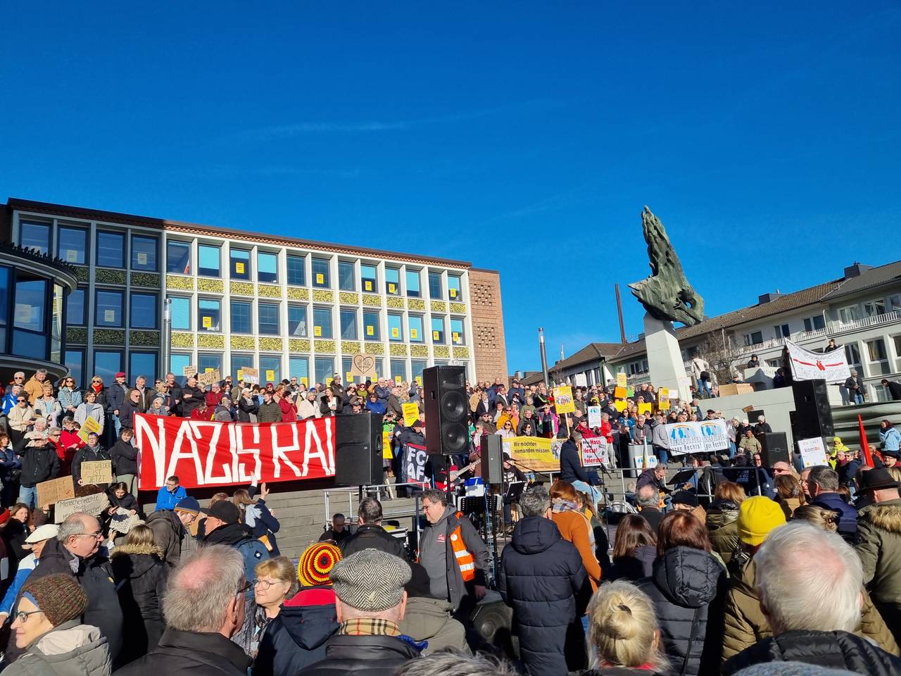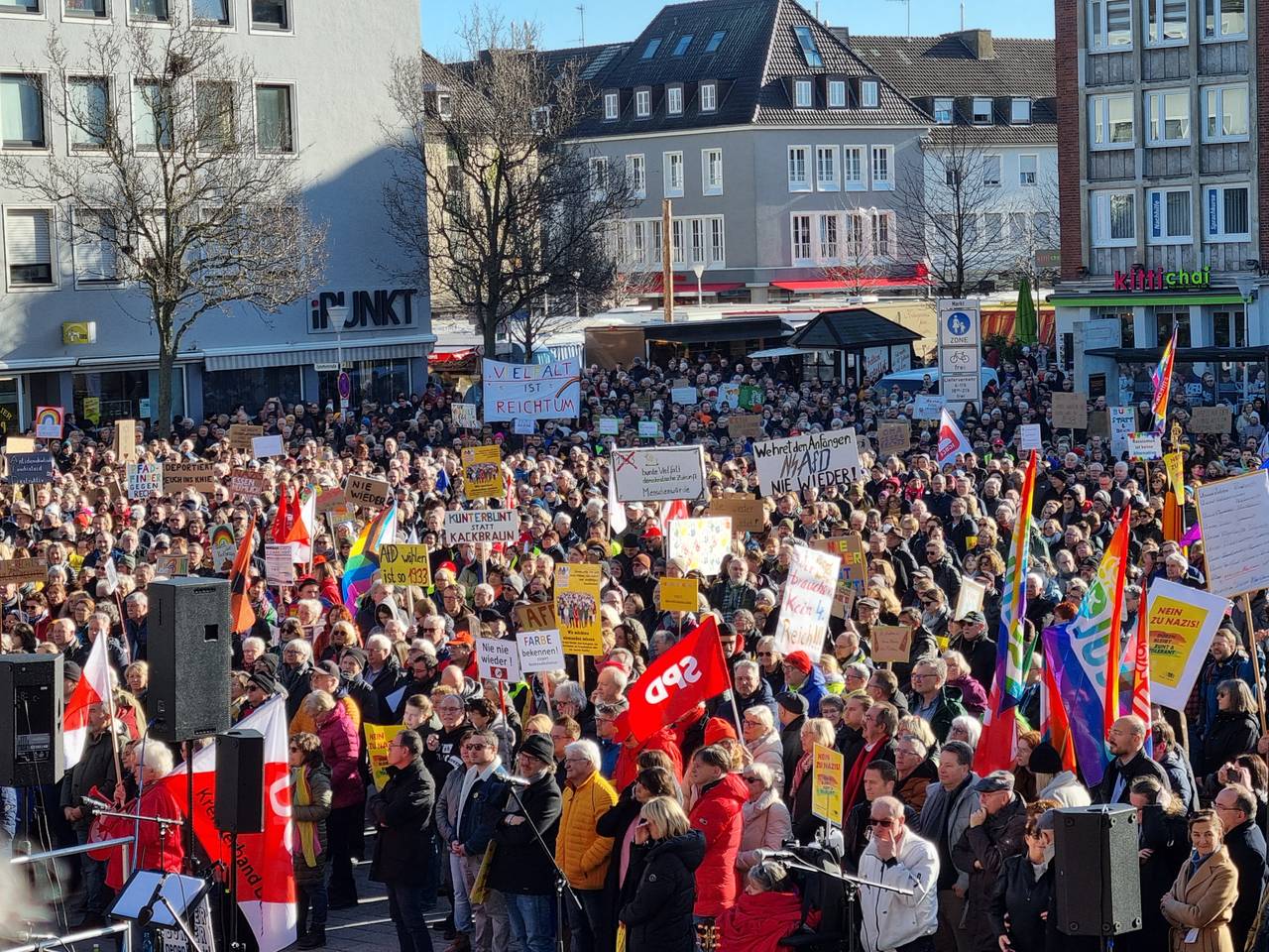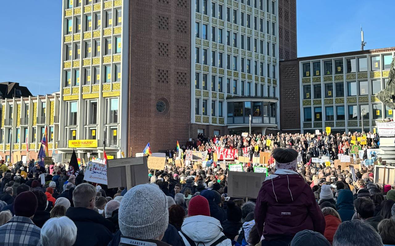 In Düren haben am Samstagmittag tausende Teilnehmer für die Demokratie und gegen Rechts demonstriert. Es gab eine Kundgebung auf dem Kaiserplatz. Nach Schätzungen der Polizei waren zeitweise bis zu 5000 Teilnehmer dort.