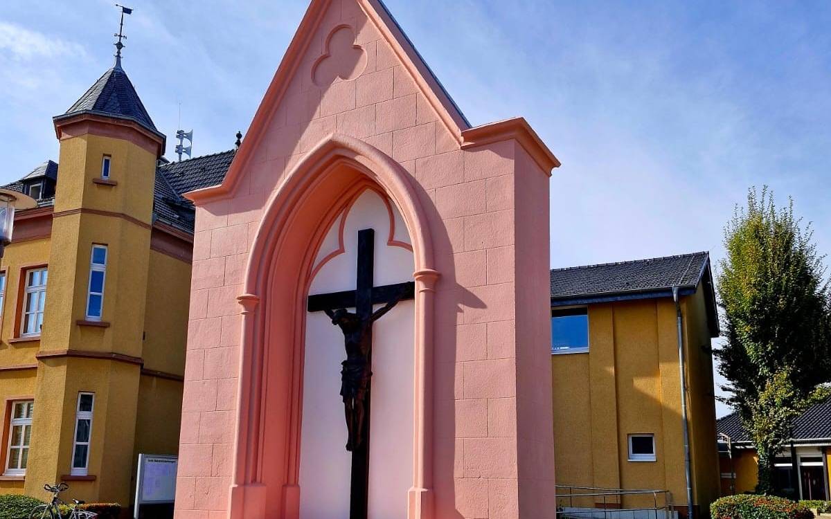 Das Denkmal vor dem Rathaus der Gemeinde Vettweiß erstrahlt wieder in neuem Glanz. Restauratoren haben den abgelösten Querbalken des Holzkruzifixes neu ausgerichtet und verleimt.