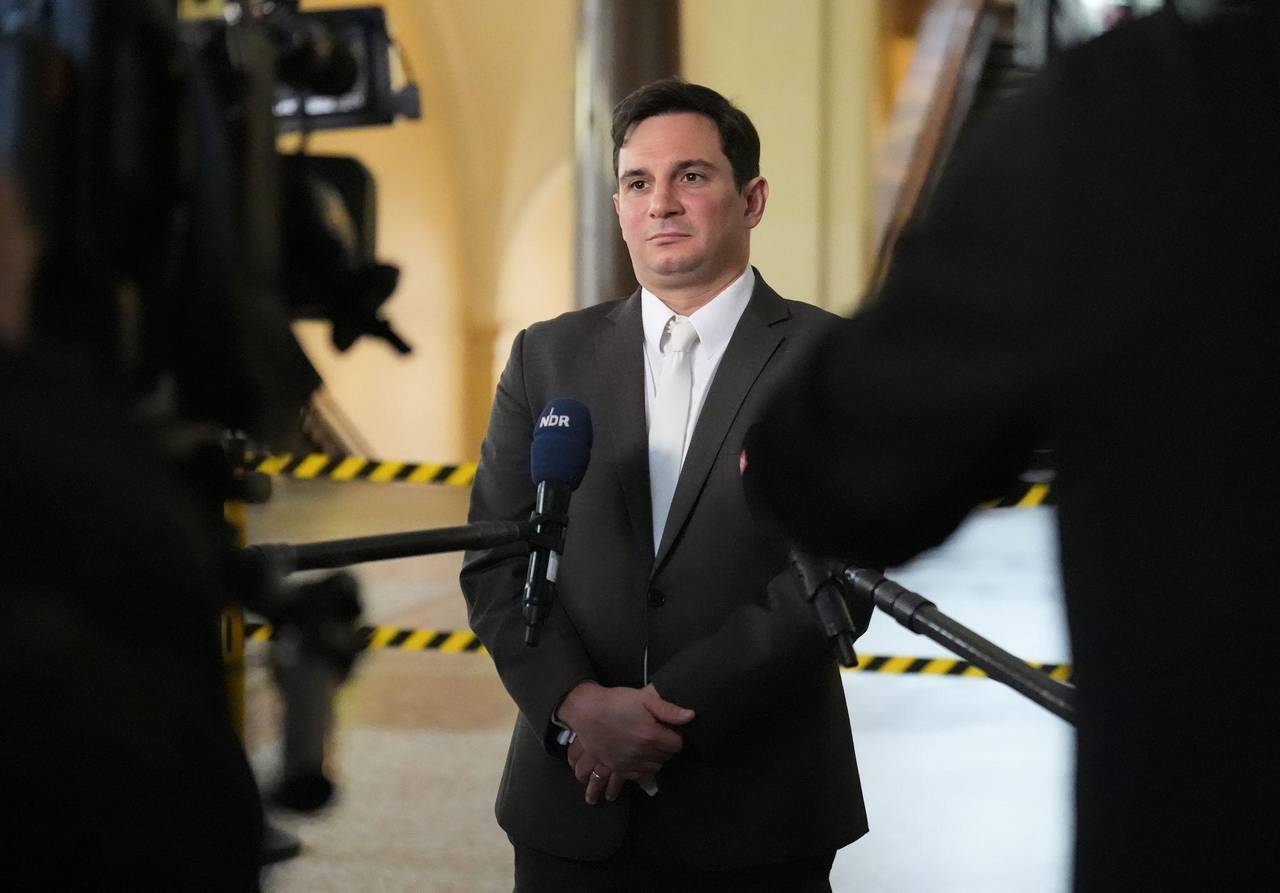 Nebenklage-Vertreter Philip von der Meden gibt am Rande des Prozesses ein Statement.© Marcus Brandt/dpa