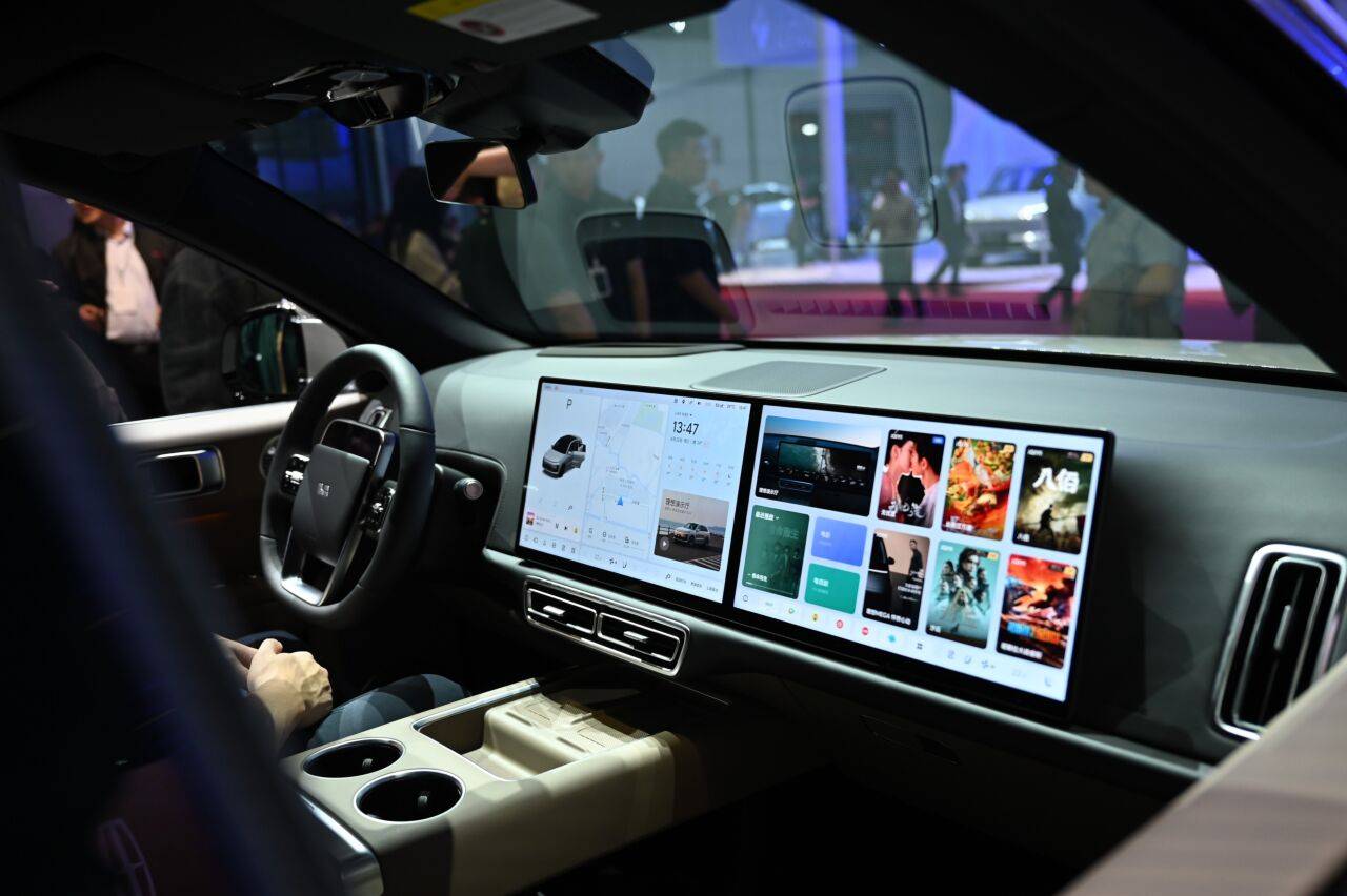 Auf dem Cockpit im Innenraum eines Fahrzeugs der chinesischen Marke Li Auto werden verschiedene Apps angezeigt.