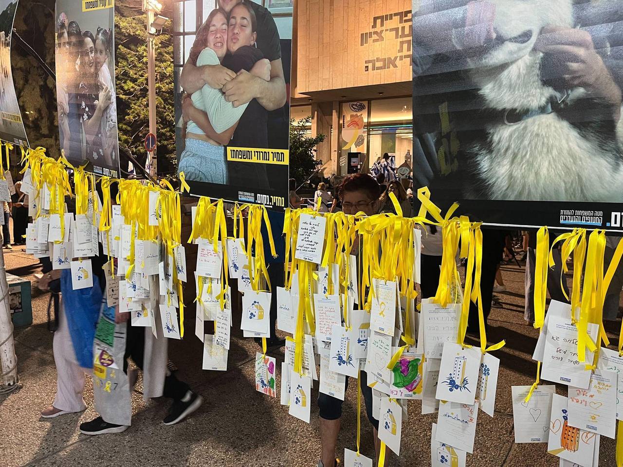 Auf dem Platz der Geiseln hängen an gelben Bändern Hunderte von Briefen, die Bürger den Geiseln geschrieben haben. «Was für eine Freude, dass Ihr wieder nach Hause kommt», steht in krakeliger Kinderschrift in einem davon.