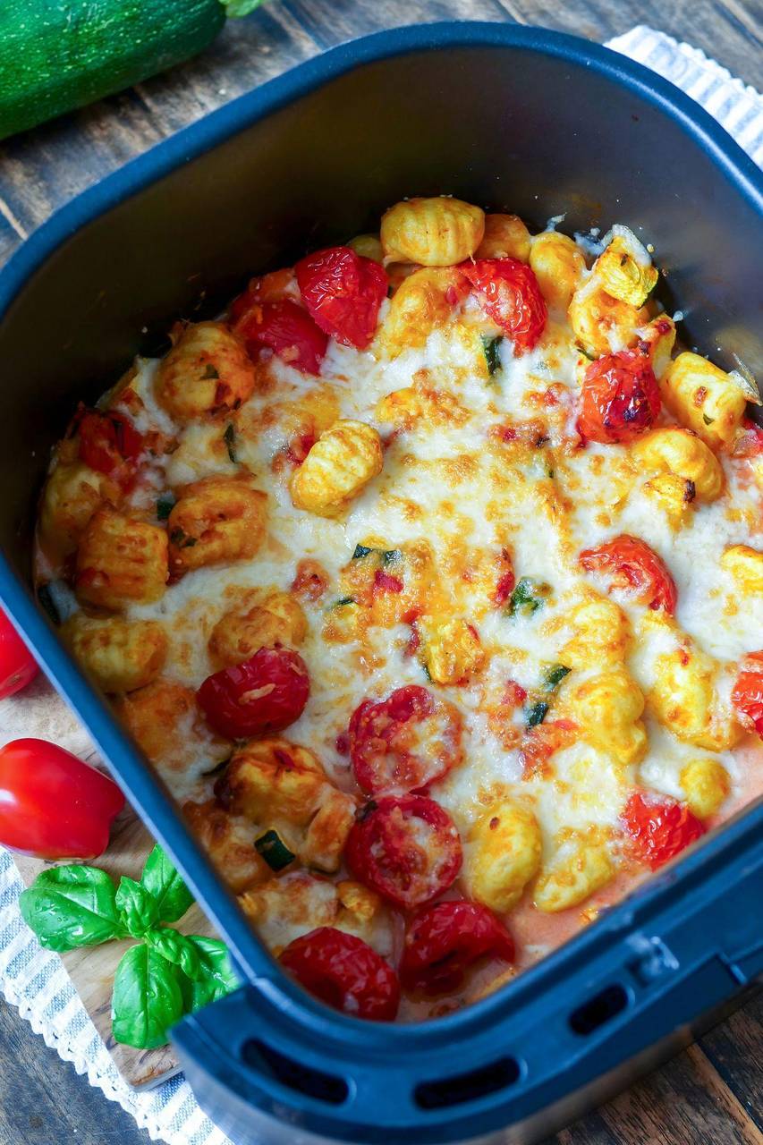 Für den Gnocchi-Auflauf kommen in den Garkorb des Airfryers Gnocchi, Gemüse und eine Sahnesoße – 15 Minuten später ist er fertig. © Steffi Sinzenich/gaumenfreundin.de/dpa-tmn
