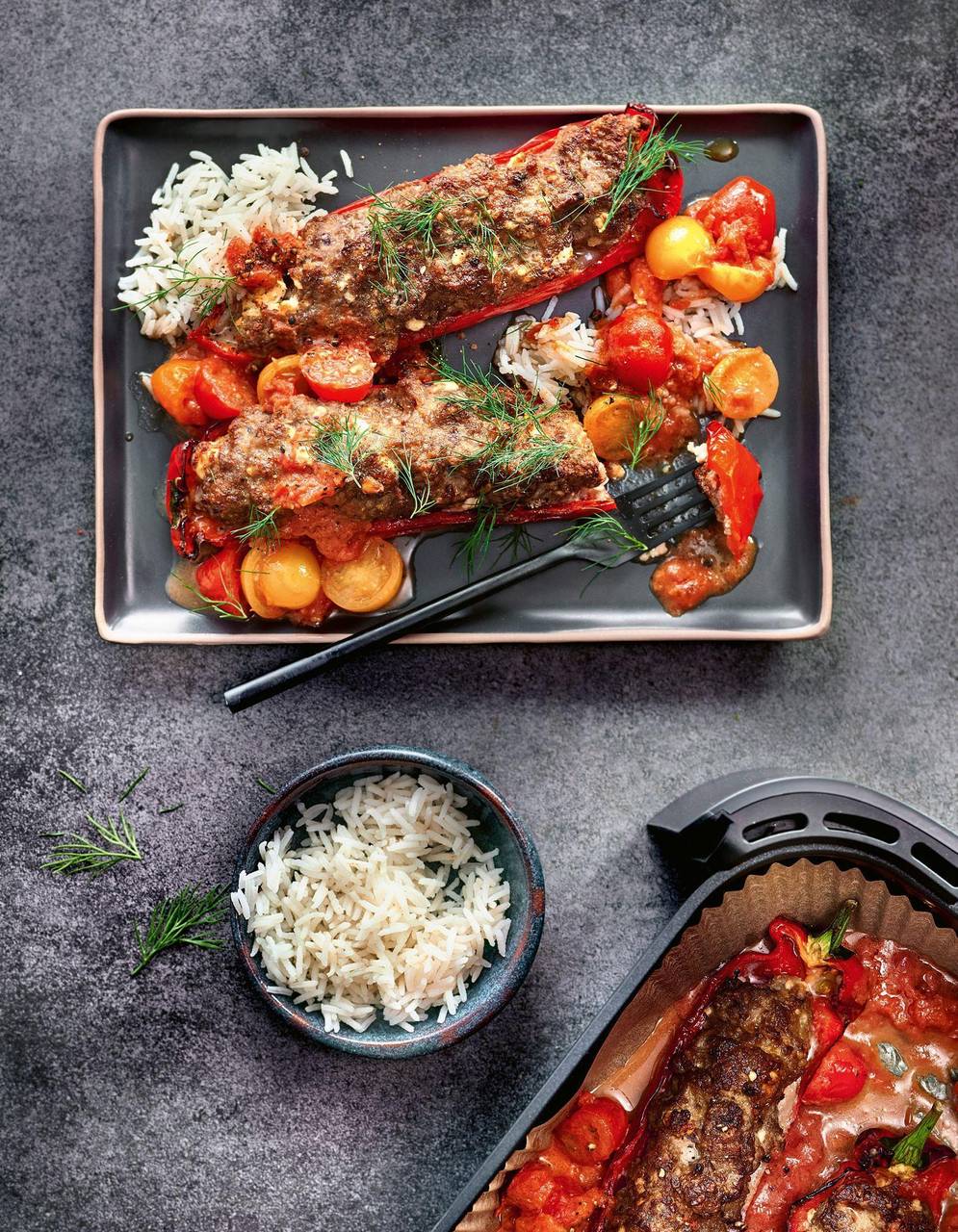 Rote Spitzpaprika werden mit einem Mix aus Zwiebeln, Knoblauch, Feta, Hackfleisch, Chiliflocken, Ei, Panko und etwas Salz und Pfeffer gefüllt, kommen dann für 15 Minuten in den Airfryer. Fünf Minuten vor Ende kommt die Soße aus Tomaten und Sahne dazu.© Hubertus Schüler/Becker Joest Volk Verlag/dpa-tmn