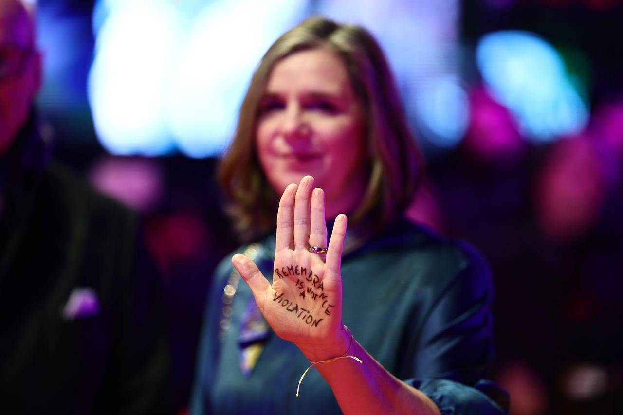 Politikerin Katrin Göring-Eckardt hat auf ihrer Hand stehen: «Remembrance is not a violation».