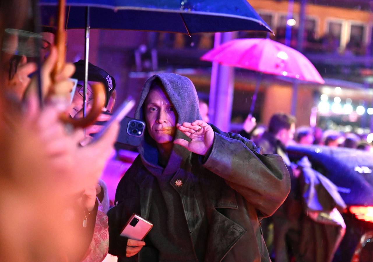 Matthias Schweighöfer auf dem roten Teppich - mit Fans und Regenschirmen.