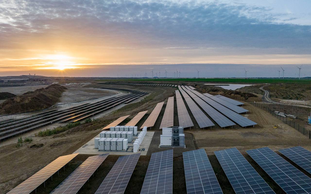 Rund 26.500 Solarmodule reihen sich im zukünftigen Böschungsbereich des geplanten Indesees aneinander. Sie sind mit einem Batteriespeicher ausgestattet und haben eine besondere Funktion: Die Module können Sonnenlicht von oben speichern – aber auch das vom Boden reflektierte Licht aufnehmen. Der Solarpark steht aktuell auf einer Fläche, die irgendwann vom Wasser des zukünftigen Indesees erreicht wird. Dann sollen die Module wieder abgebaut werden.